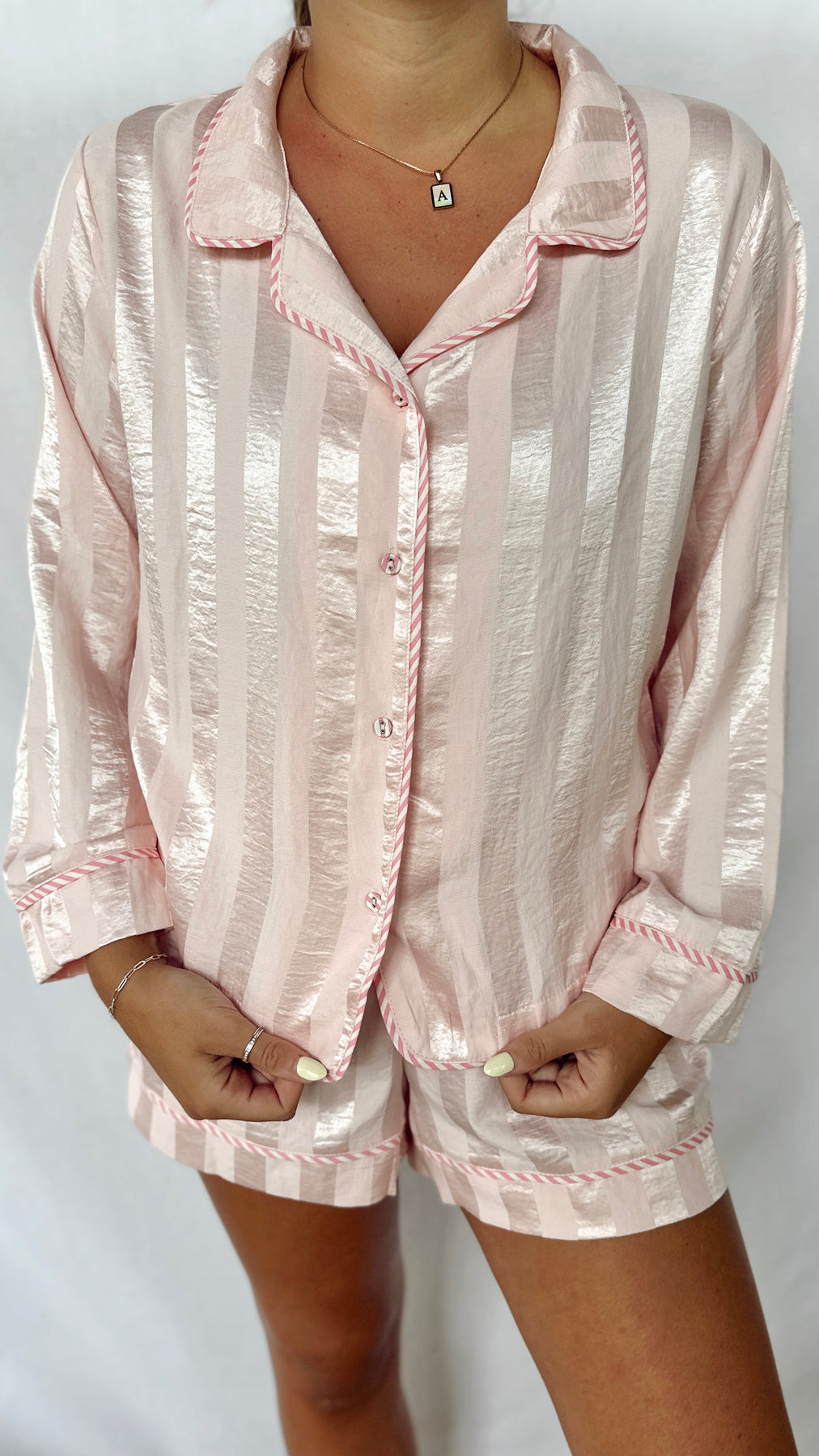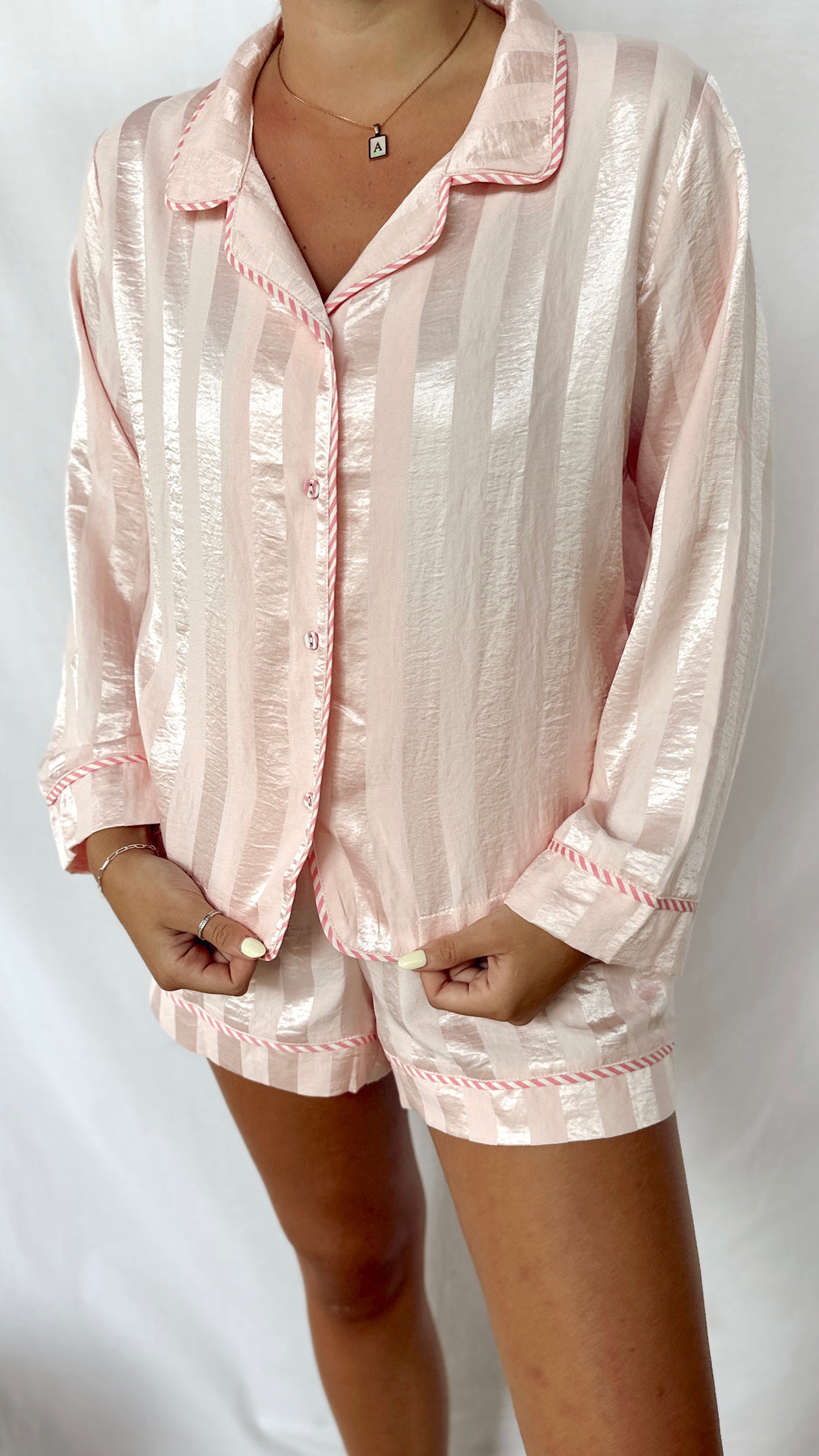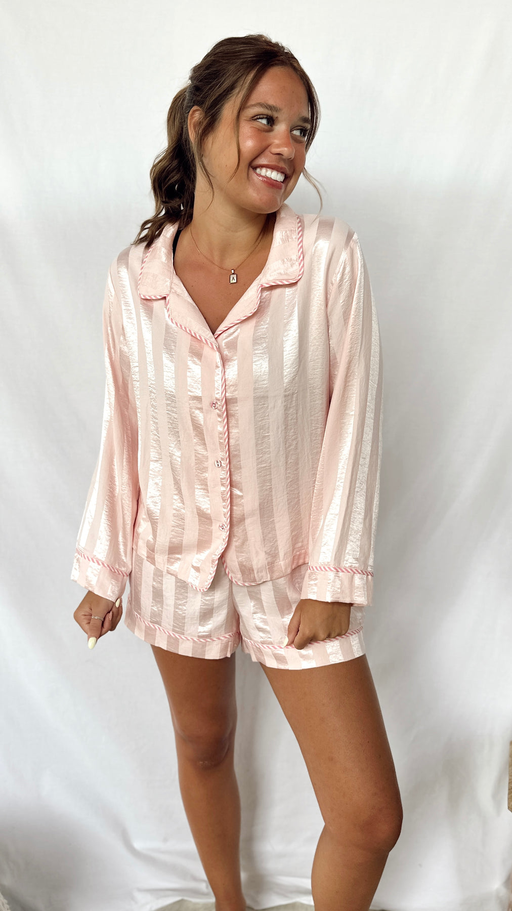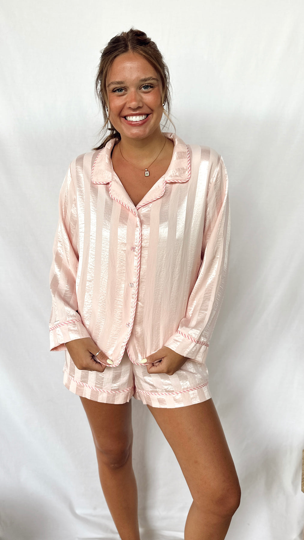 Enjoy cozy nights in The Sweet Sugar PJ Set, featuring a playful pink top paired with shorts adorned with pink and white striped details. The shorts are finished with a charming striped bow, adding a touch of fun to your loungewear. Perfect for comfort with a sweet style.
