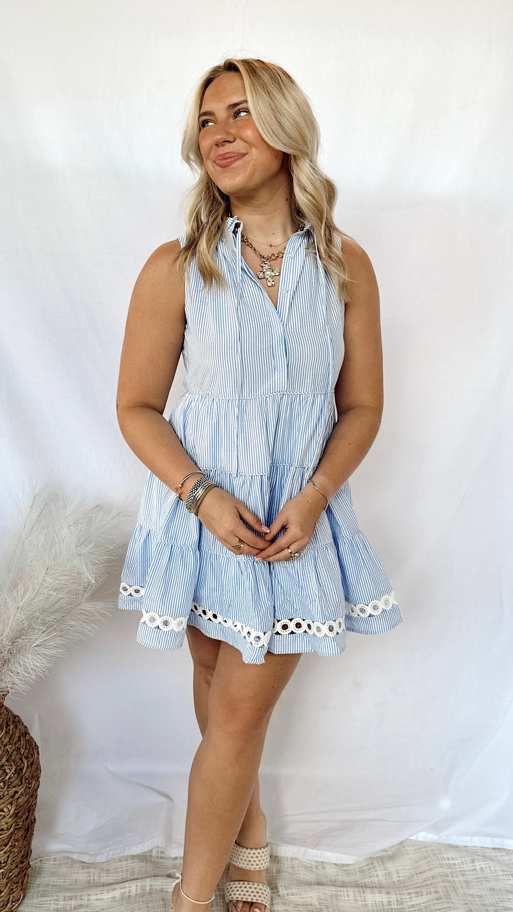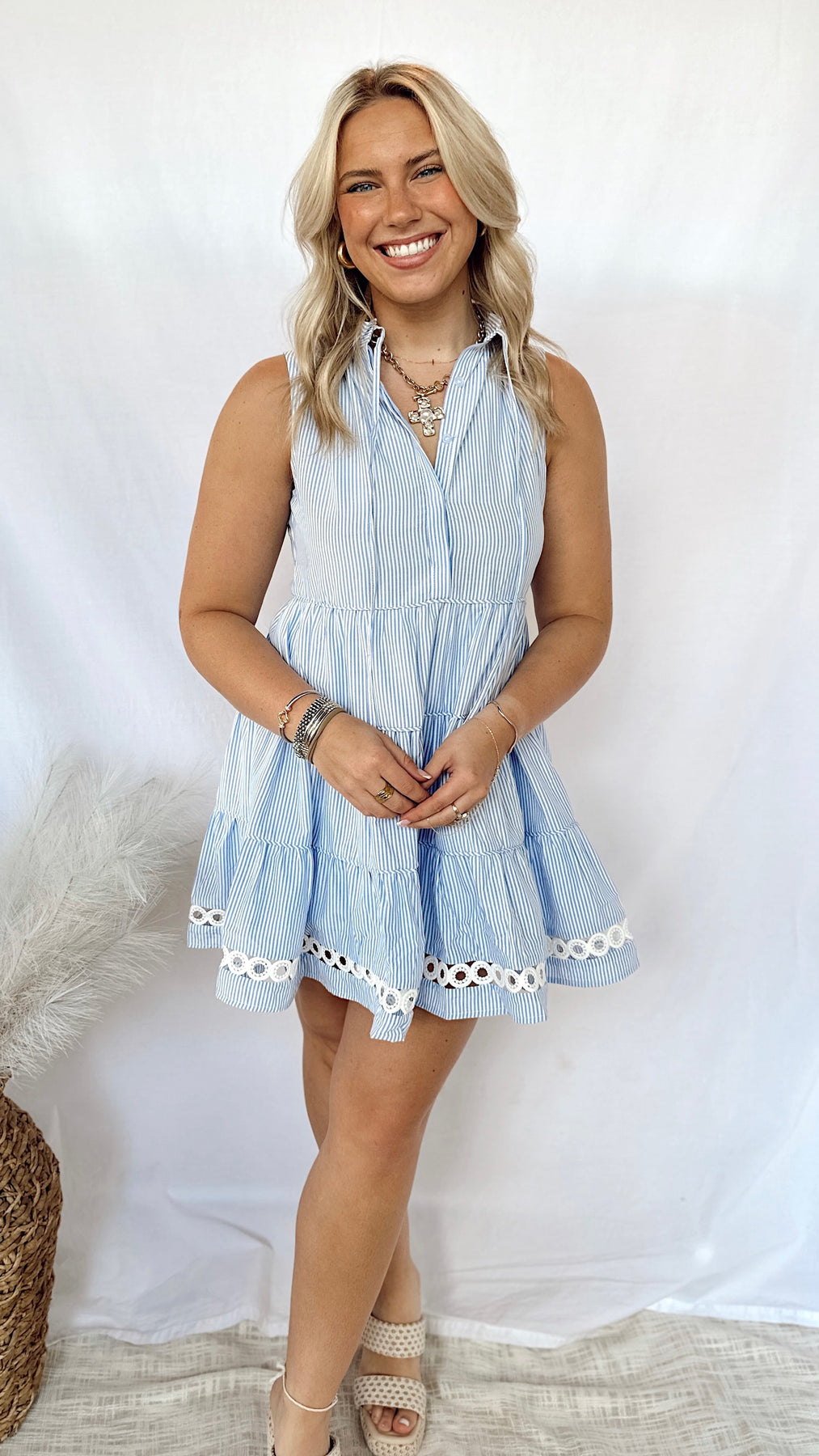 The Sydney Dress brings a fresh, playful vibe with its classic blue and white stripes. Finished with charming sewing details at the hem, it adds a subtle touch of flair to your summer wardrobe. Perfect for sunny days and casual outings, this dress combines comfort with a breezy, fun style.