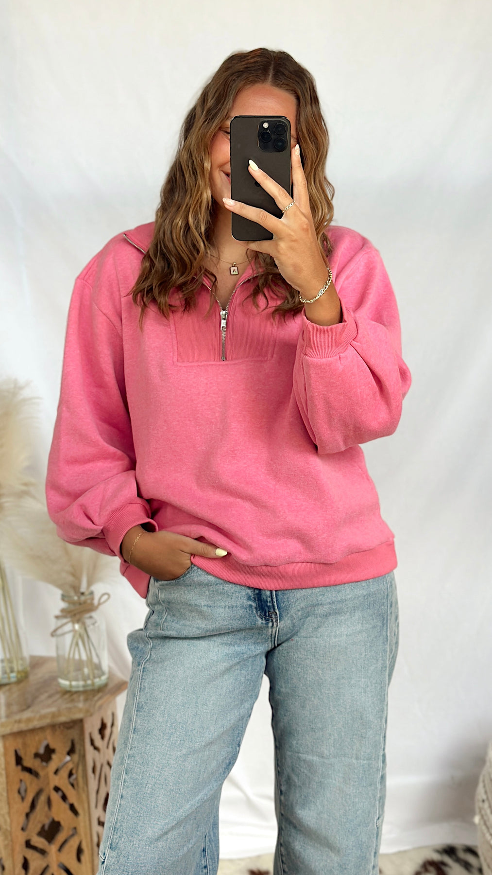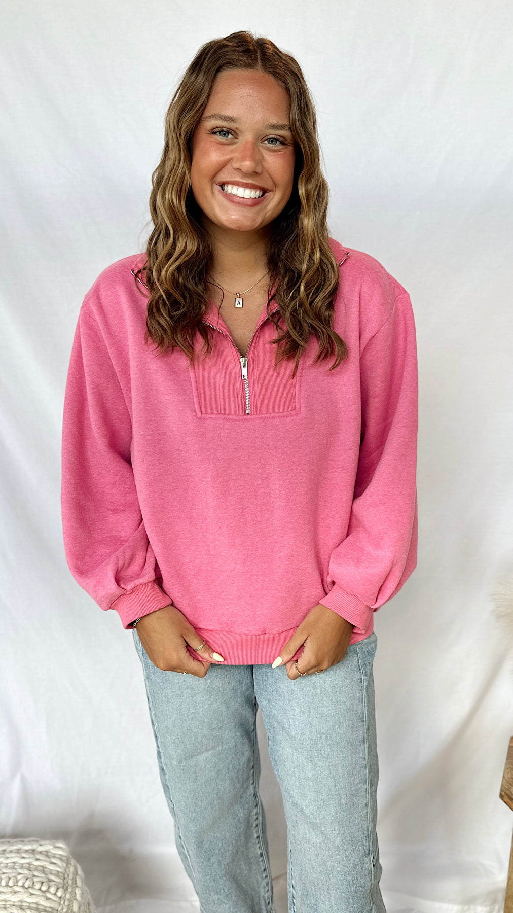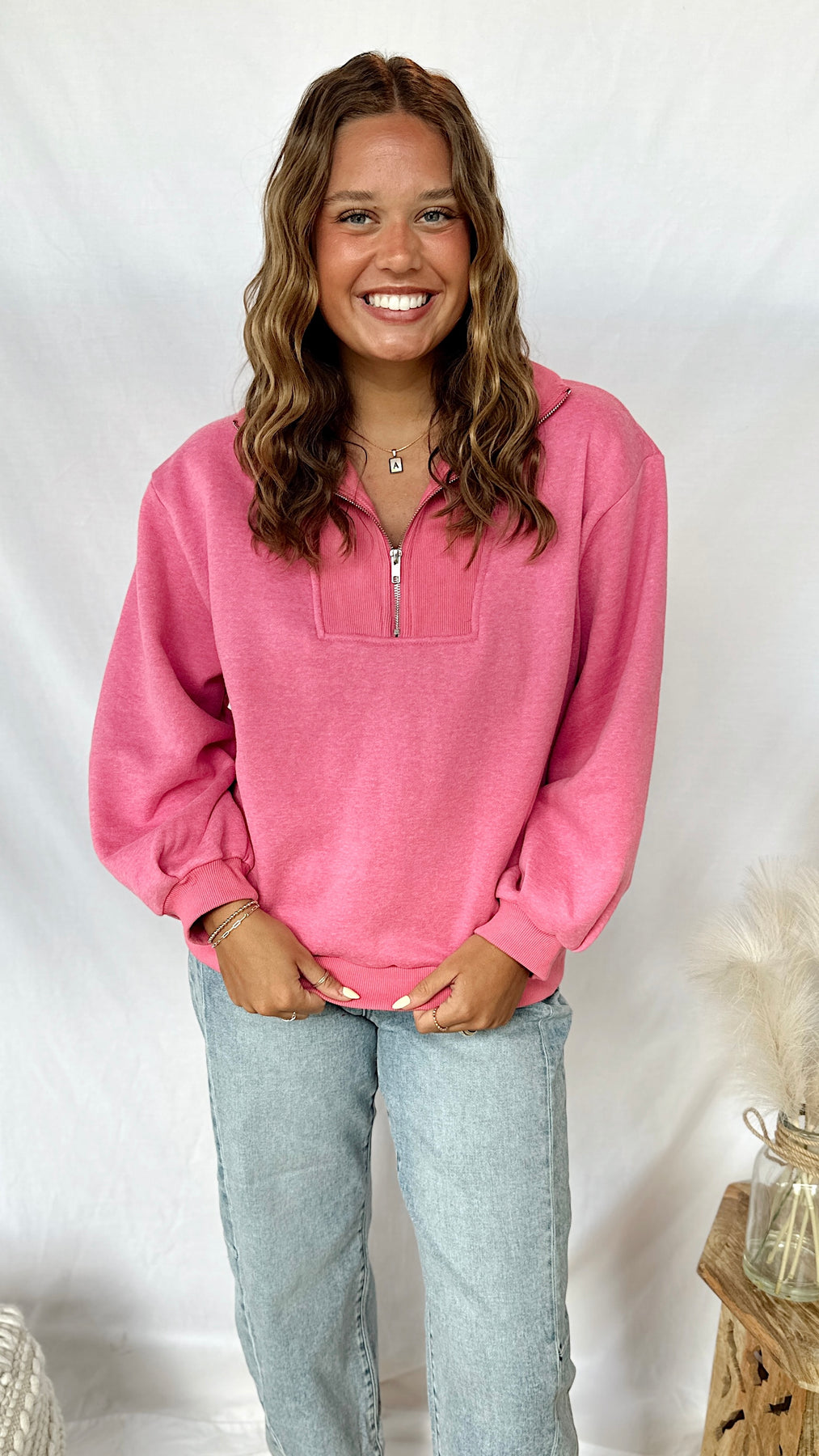 Stay cozy and cute in The Too Precious Quarter Zip. This pink quarter-zip sweatshirt adds a playful pop of color to your casual looks while keeping you warm and comfy. Perfect for layering or wearing solo on breezy days, it’s your go-to for effortless style with a fun twist.
