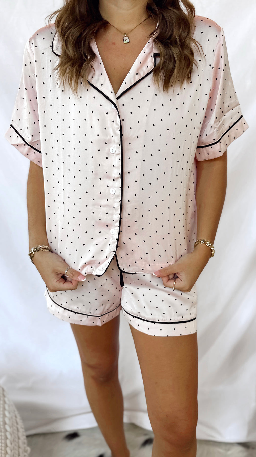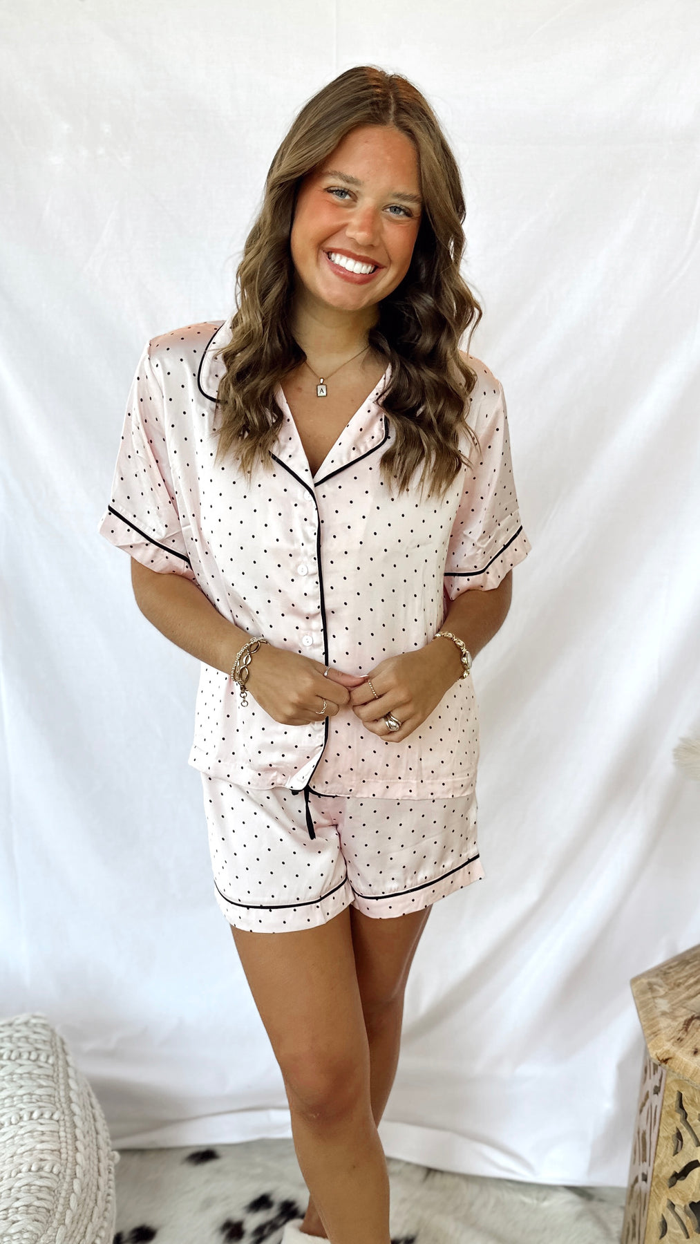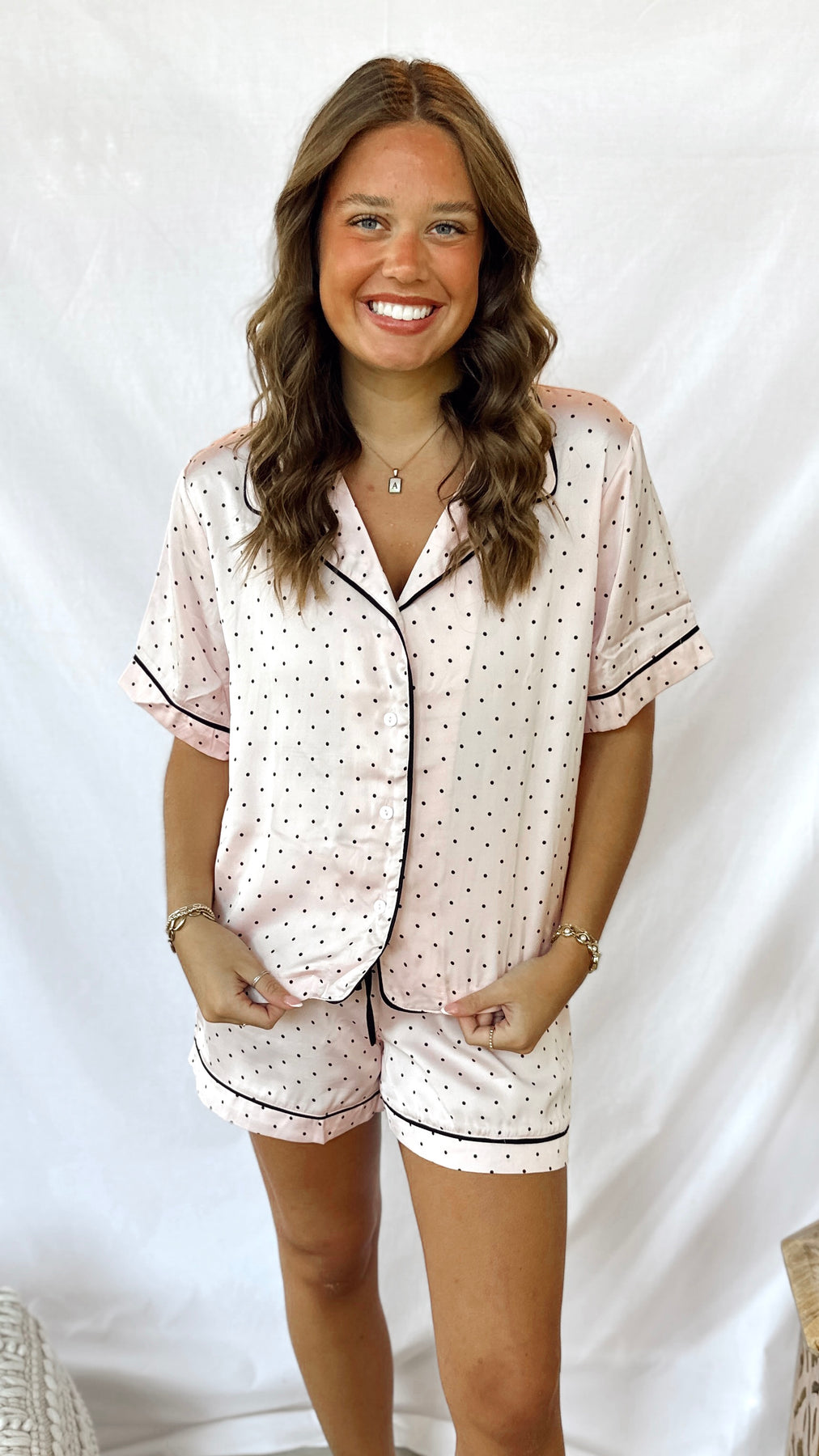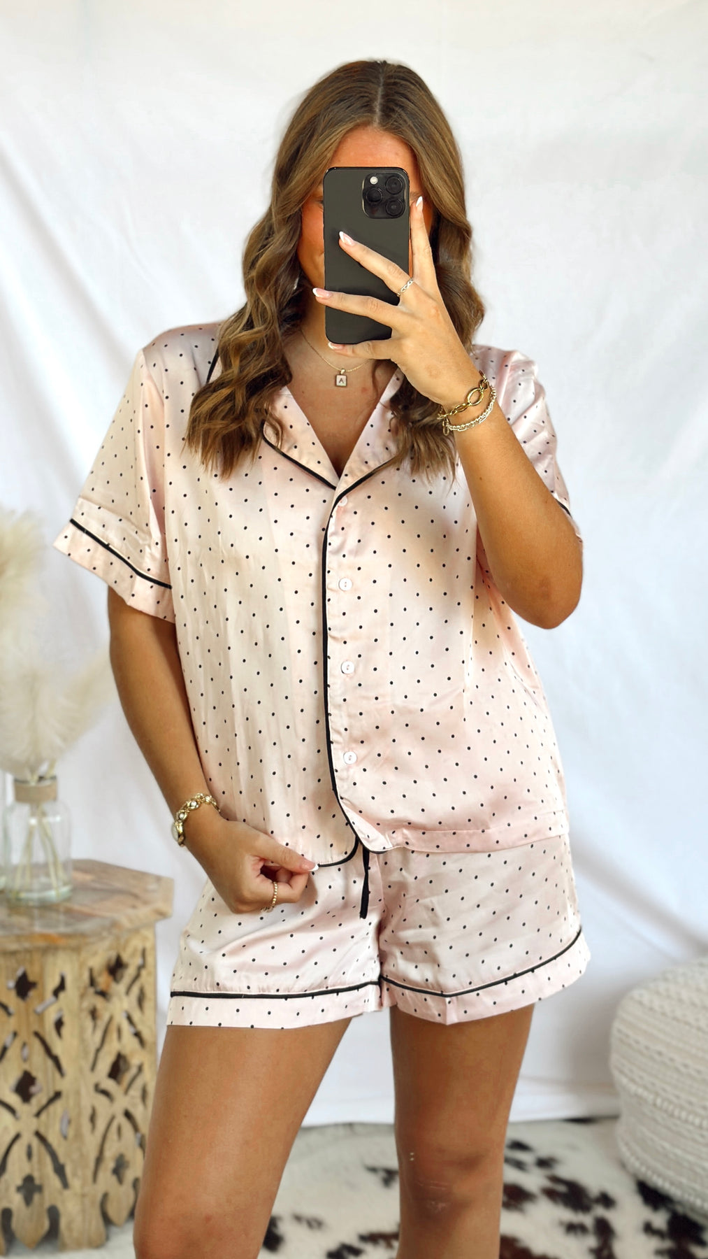 Slip into playful comfort with The Victoria Pajama Set. Featuring soft pink satin adorned with chic black polka dots, this set brings a fun, stylish vibe to your nighttime routine. Lightweight and smooth, it promises cozy, breathable sleepwear that feels as good as it looks. Perfect for lounging or dreaming in style!